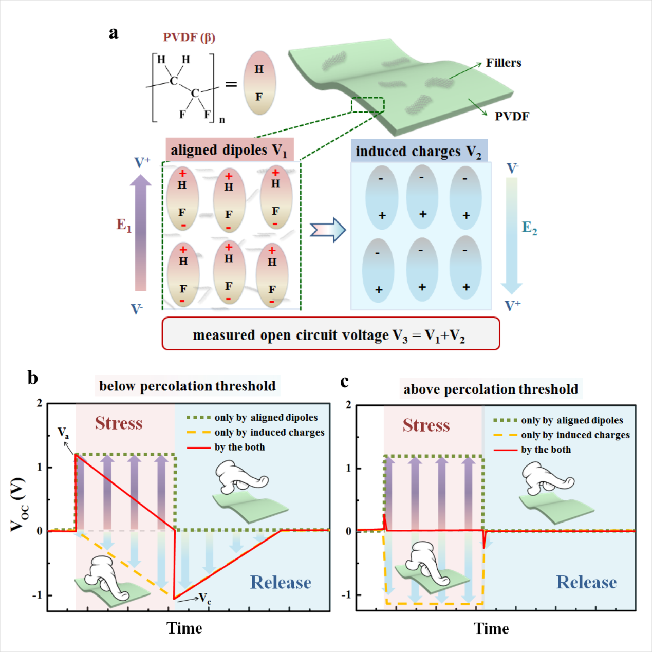 图1. 复合薄膜的压电-介电耦合示意图以及低于和高于渗流阈值时的开路电压随时间变化关系图
