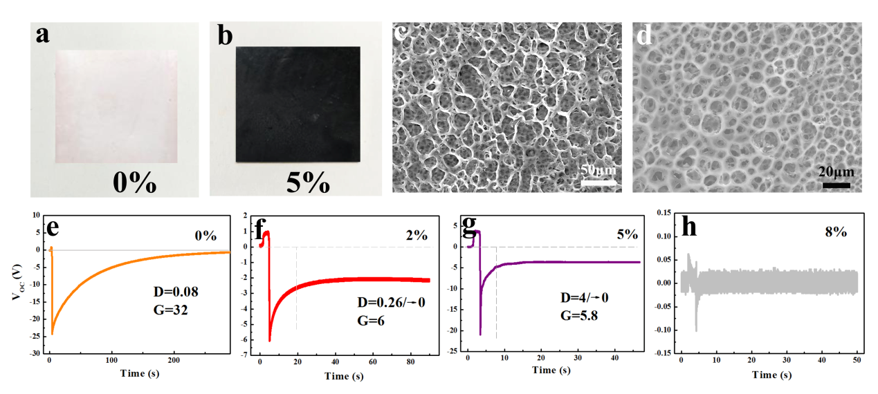 图2. 多孔膜形貌及不同填料含量的多孔膜开路电压