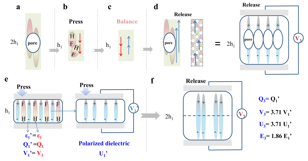 图3. 多孔薄膜形变过程中,当偶极子长度改变时,压电-介电耦合过程的示意图