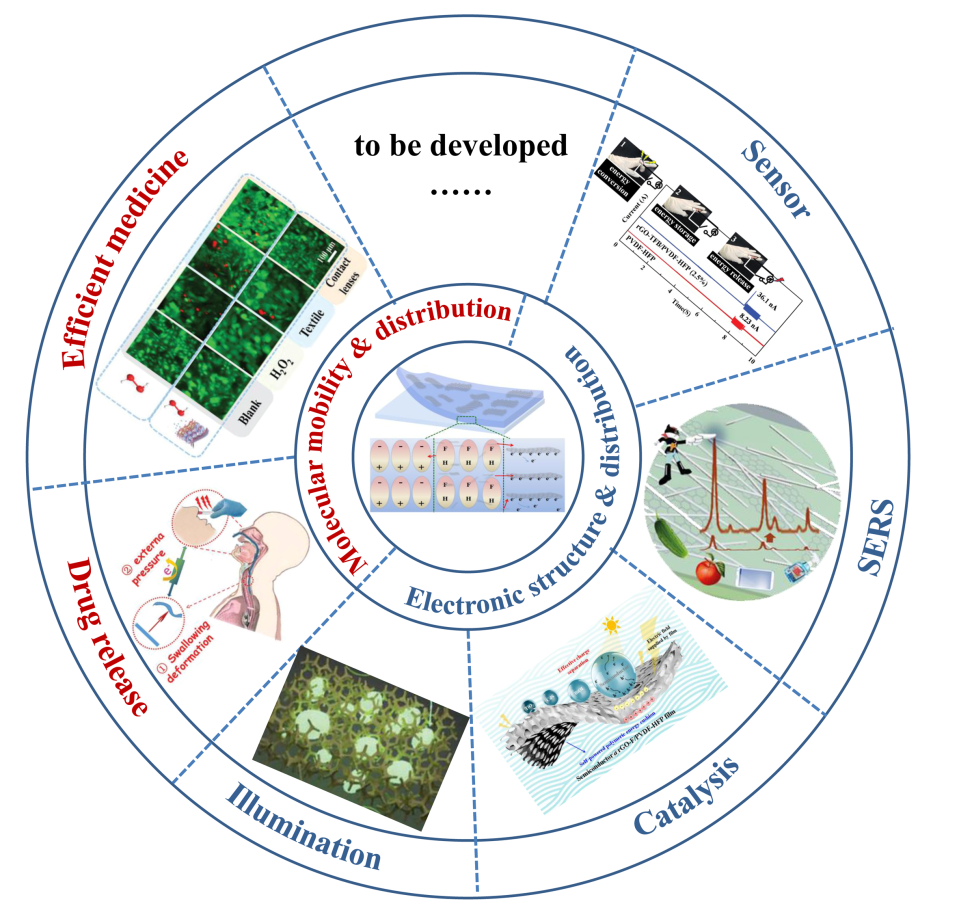 该压电-介电耦合的能量转换在很多复合材料和自然系统中存在,该模型的建立希望有助于理解生物体系中已有的类似现象,同时激发新材料的设计和优化,以适应各种机械类型以及不同频率力的刺激和作用,实现高效的电能转化。同时团队利用压电-介电耦合薄膜或压电-感应电荷耦合,已将其应用在传感、药物释放、活性分子控释、表面拉曼增强、光催化增强以及发光等领域(Angew. Chem., Int. Ed. 2017, 56, 2649., Adv. Funct. Mater. 2015, 25, 7029., Nano Energy 2018, 53, 513., Small 2018, 14, 1802136., Nanoscale 2019, 11, 14372., Nanoscale 2018, 10, 5489.),如图4所示。