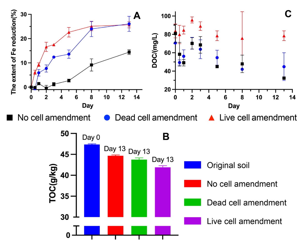 图1 A) 铁的还原程度B) 土壤中有机碳的含量C) 溶液中溶解有机碳的含量随时间变化