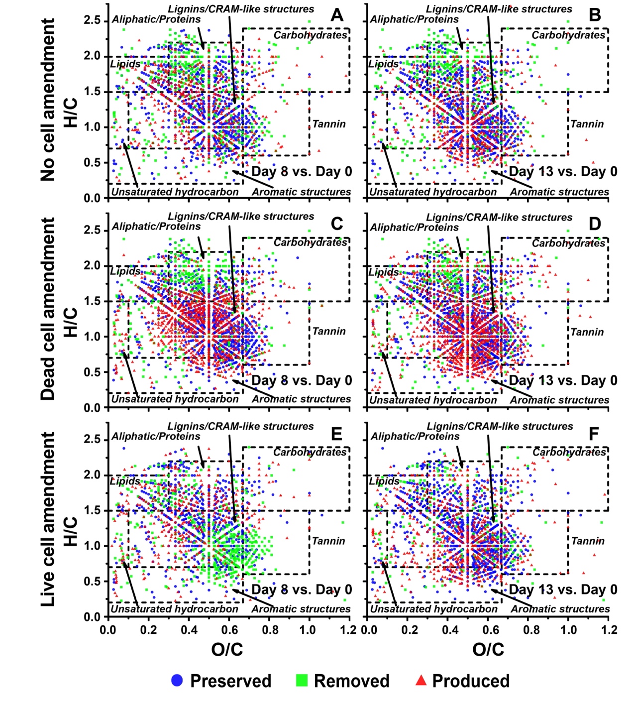 3、活菌细胞的加入可以直接增强Fe(III)还原的速率和程度,且还原速率大于加入死菌残体(图1)。并且由于生物易降解的有机质被外源菌消耗,进而促使土壤中一些难降解的有机质(芳香类)开始被原生微生物群落所降解(图2);