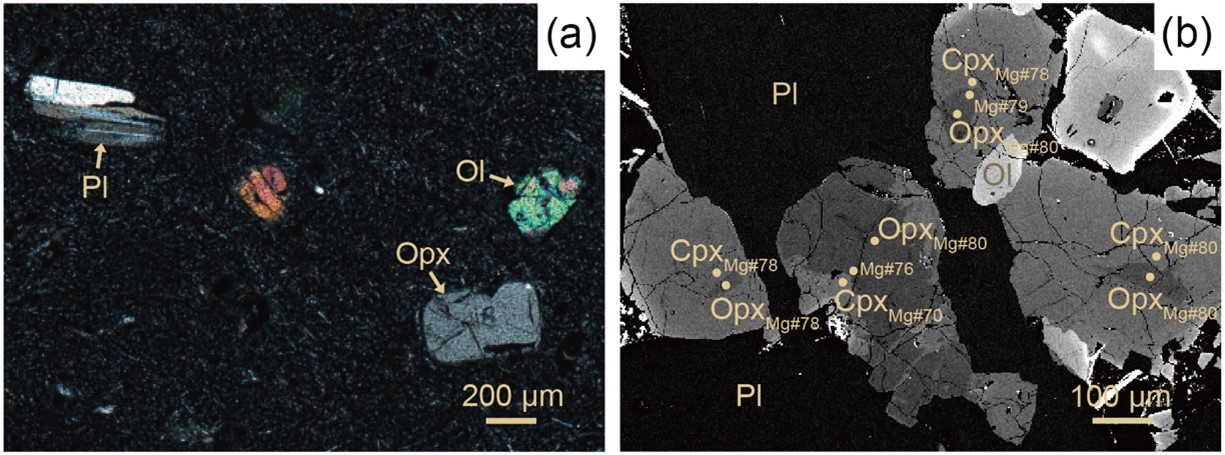 前人研究表明,玄武质岩浆大多以晶粥体(crystal mush)的形式存储在地壳深部(例如Marsh, 1981; Holness et al., 2007; Heise et al., 2007; Cooper & Kent, 2014; Jay et al., 2014)。即使是在地壳相对较薄的地区,包括洋中脊、岛弧和洋岛玄武岩的研究也普遍显示,它们在洋壳内普遍存在多级晶粥系统。当幔源岩浆从深部上升、注入浅部(高位)晶粥时,便会使浅部岩浆房中较早就位和冷却中的岩浆,即晶粥体发生解离(disaggregation),从而产生晶粥体碎块。当岩浆携带晶粥体碎块喷发出地表时,一般会形成富斑晶(>30 vol.%)的玄武岩,晶粥体碎块也常以聚斑晶(glomerocryst)的形式产出,当晶粥体碎块比较大时,也可以以同源包体的形式产出。晶粥体碎块(聚斑晶或同源包体)及其矿物结构携带着大量来自深部的信息。与洋壳的结构和物质组成可以通过蛇绿岩套等完整剖面进行直接观察和研究不同,对于相对缺乏完整剖面的大陆地壳,尤其是新生陆壳深部的结构和物质组成我们还缺少系统的认识。例如,虽然下地壳整体成分为镁铁质的,但是变质地块和下地壳包体却通常显示出较宽的成分范围。综上所述,我们对于陆壳深部的结构和物质组成,以及其会如何影响穿过地壳的岩浆演化过程还缺乏系统的认识。