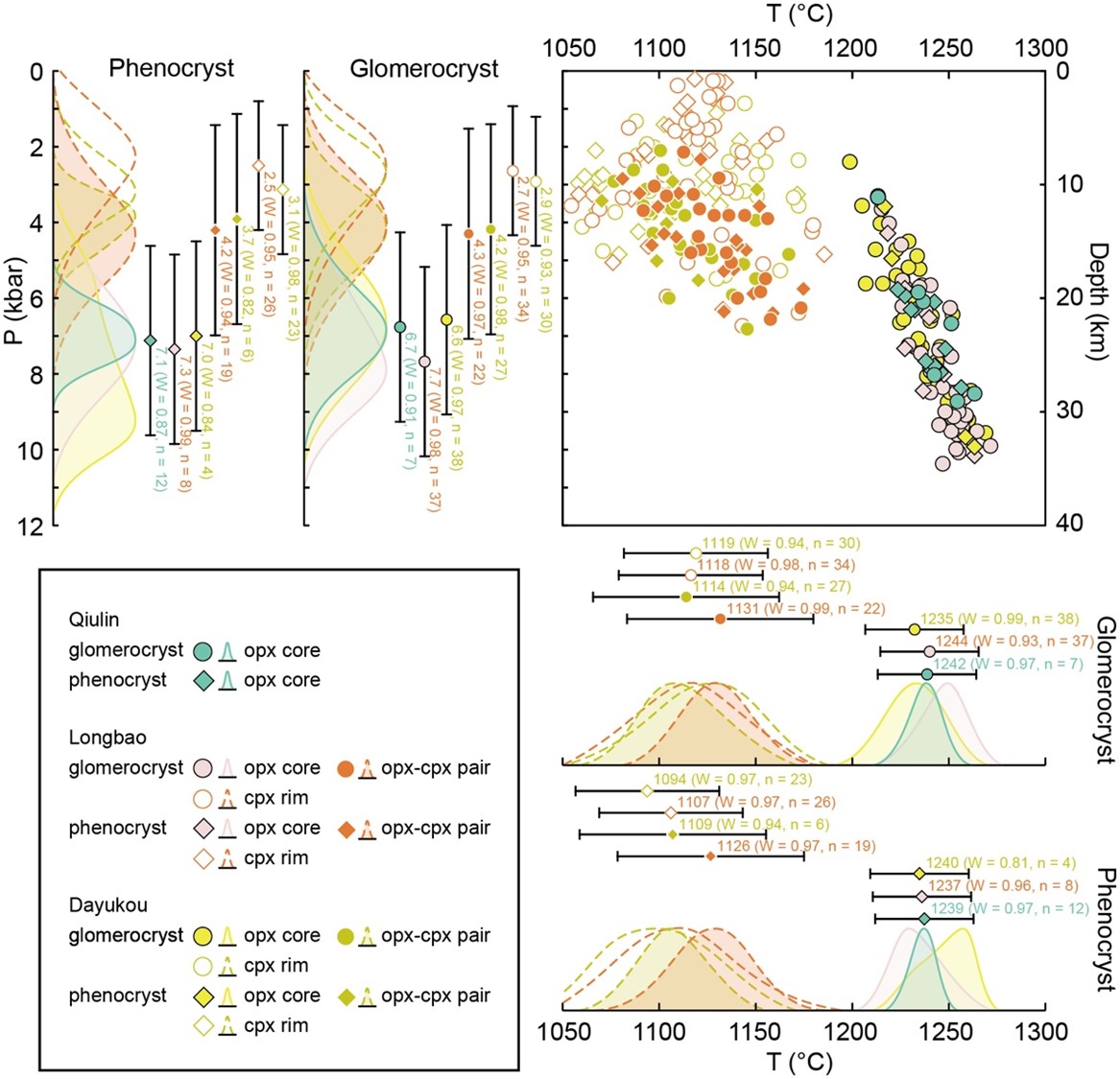 图2 三座火山辉石矿物温压计估算结果及核密度分析