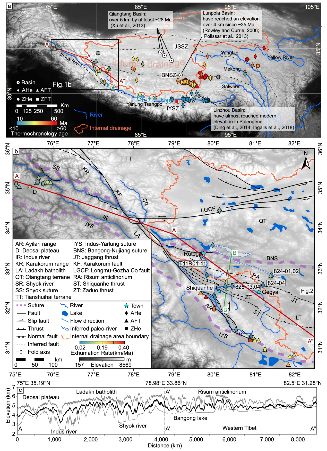 地貌是构造与气候之间复杂相互作用的产物,因此地貌演化对于理解青藏高原的生长过程及其机制至关重要。青藏高原内部地形平坦,发育内流水系,该地貌特征被认为始新世早期就已经形成;而高原南部和东部则被外流水系和构造活动强烈改造,自中新世以来形成了陡峭的地貌。高原西部以高海拔低起伏的地形为主,但部分地区发育有深切河谷;以内流水系为主,但外流水系在南部边界发育(图1)。因此,高原西部地貌兼具高原内部和东部与南部的特征。上述复杂的地貌特征到底是何时以何种方式发育演化而来?其形成过程到底经历了多少期剥露事件?这些剥露事件的控制因素是什么?内、外流水系在改造高原西部地貌中的作用是什么?