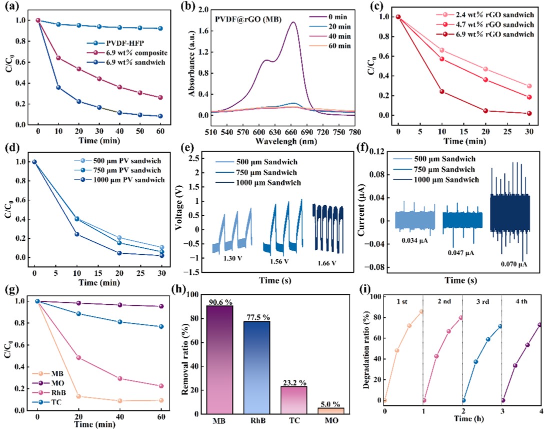 图2 PVDF-HFP@rGO对污染物降解的性能。(a)不同结构薄膜对MB染料的降解情况,(b)PVDF-HFP@rGO降解MB时其吸光度变化,(c)负载不同rGO含量对MB降解的影响。(d)不同PVDF-HFP厚度对MB降解的影响。静电屏蔽后不同厚度的PVDF-HFP压电夹层膜的电输出:(e)开路电压和(f)短路电流信号。(g)PVDF-HFP@rGO夹层膜对不同染料的降解和相应的(h)降解率。(i)对MB的重复降解试验