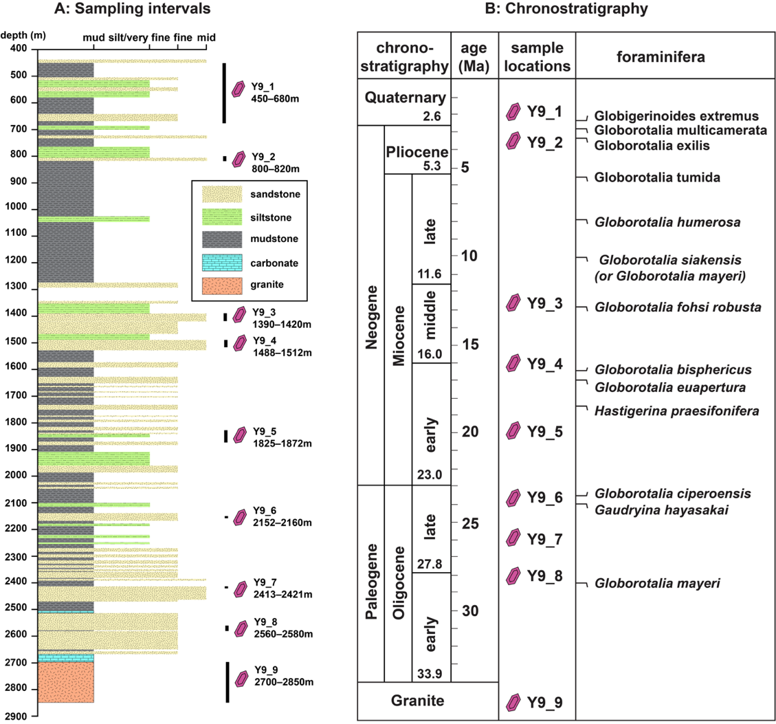 图2 本研究中陆架上的探井的样品分布与年龄格架