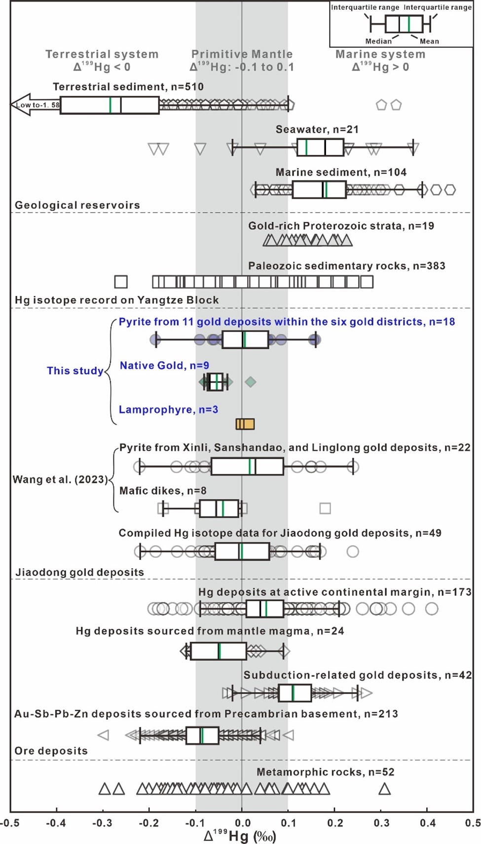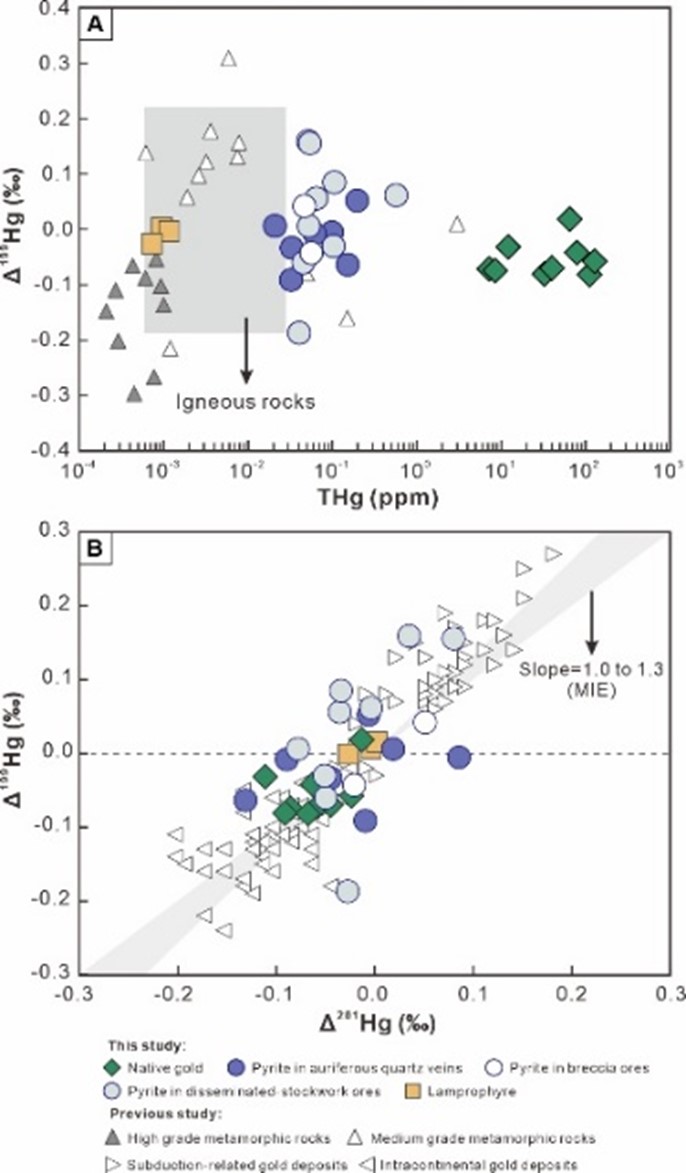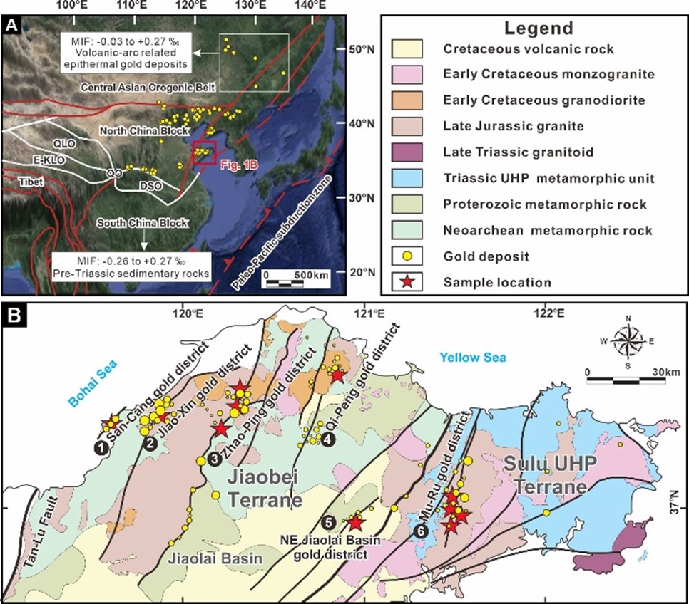 地壳变质脱水模型认为造山型金矿床成矿物质来自上地壳岩石绿片岩相到角闪岩相进变质脱水作用。胶东金矿省是我国最大的金矿集区,其成矿时间晚于区域变质峰期约18亿年,地壳变质脱水模型无法解释胶东金矿床成矿物质来源。基于元素地球化学和Sr-Pb-S同位素分析,前人提出胶东金来源于下地壳重熔花岗岩、交代岩石圈地幔、俯冲洋片及上覆沉积物等不同认识。但由于热液流体演化和水岩反应过程可能掩盖源区同位素信号,胶东金来源仍存在争议。汞是唯一显示显著质量分馏(MDF,δ202Hg)和非质量分馏(MIF,Δ199Hg)的金属元素,且在热液体系中显示出与金相似地球化学行为,因此是揭示金来源的有效示踪剂。此外,海相沉积物、陆源碎屑沉积物、原始地幔则具有截然不同的MIF-Hg信号,且该信号可以在岩浆和热液过程中保留。因此,Hg同位素可以揭示成矿源区,是解决胶东金来源科学问题的有利手段。