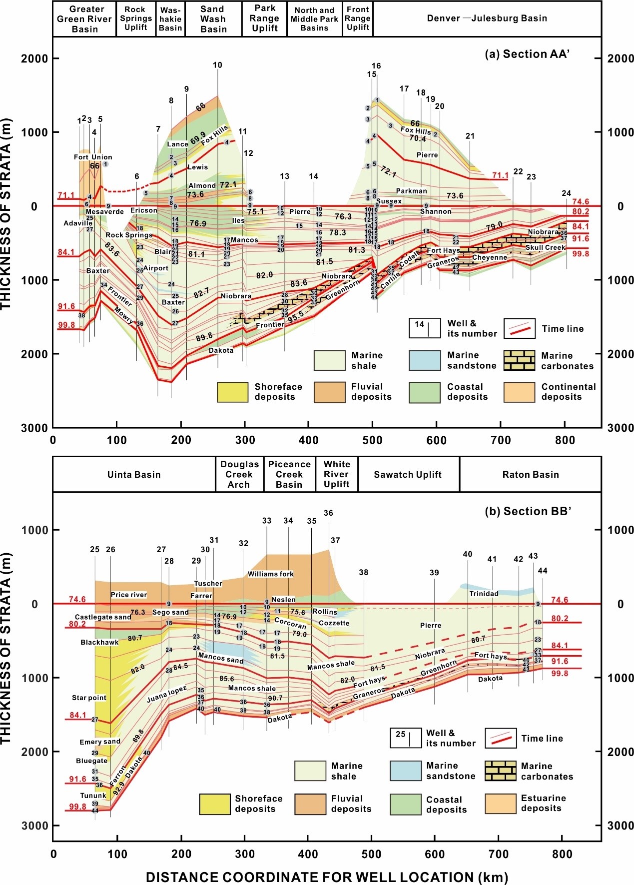 (2)周期性的快速构造沉降脉冲与Sevier-Laramide造山期不同阶段的碎屑楔内地层几何结构存在不同的耦合关系,Sevier碎屑楔记录了初期广泛海侵与后期沿海进积堆积;而Laramide碎屑楔内则记录了初期进积堆积与后期海岸退积;