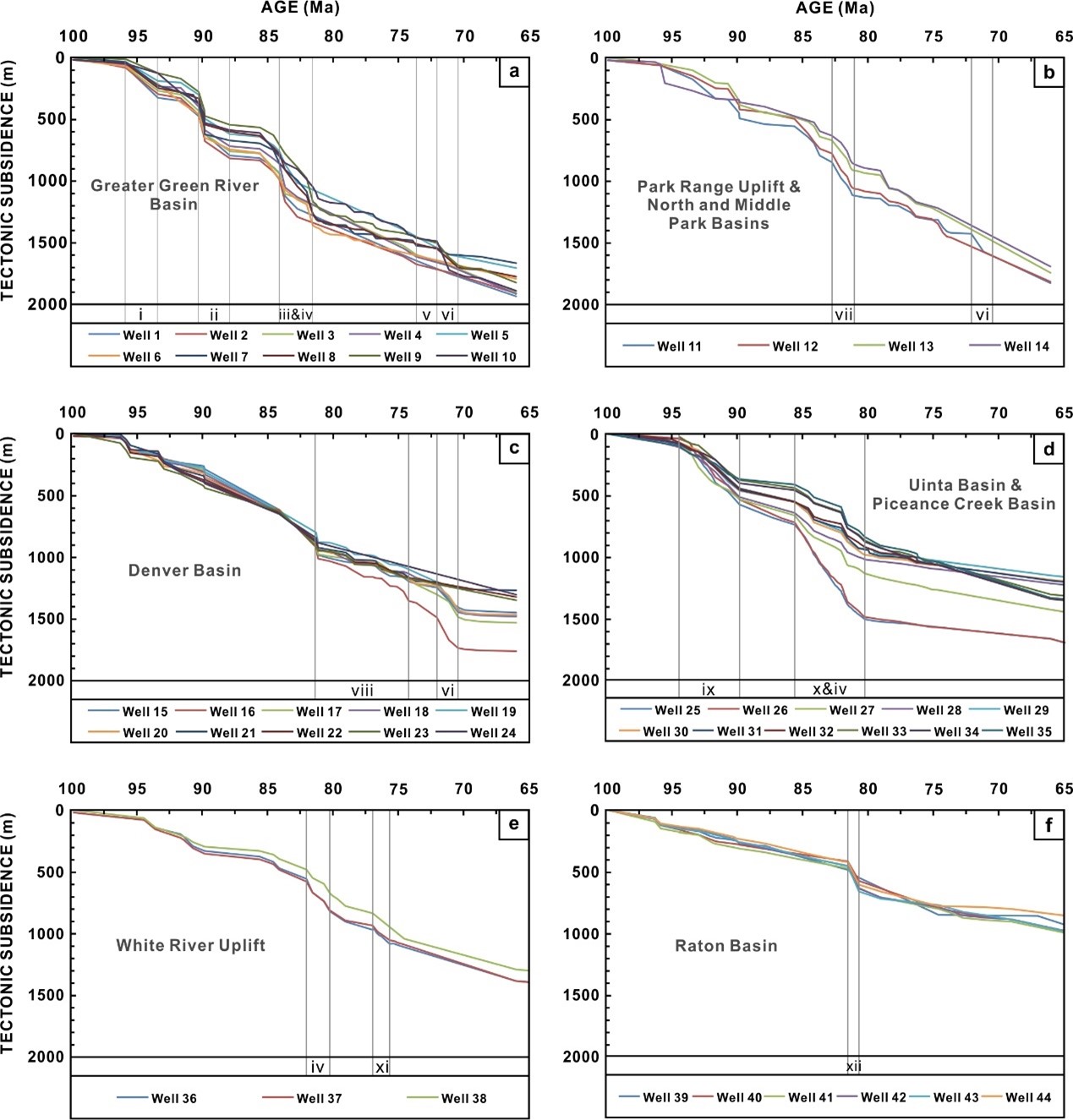 目前,针对北美西部内陆盆地内由于深部地幔活动引起的长波长动力沉降以及Sevier造山带和Laramide隆起产生的挠曲负载所引起的短波长重复沉降脉冲的研究已有大量研究成果。然而关于盆地演化过程中重复的短期沉降脉冲与Sevier-Laramide造山期形成的碎屑楔内不断变化的几何结构之间的关系仍然缺乏全面分析和讨论;另外,在已有的研究成果中,众多学者仅从剖面的角度利用挠曲回剥对长波长动力沉降进行了定量的分离;而有关构造沉降史的恢复,有学者通过挠曲回剥去除了盆地内的沉积物负载影响,但构造沉降与动力沉降在高时间分辨率下的详细变化却并没有获得更细致的观察和讨论。