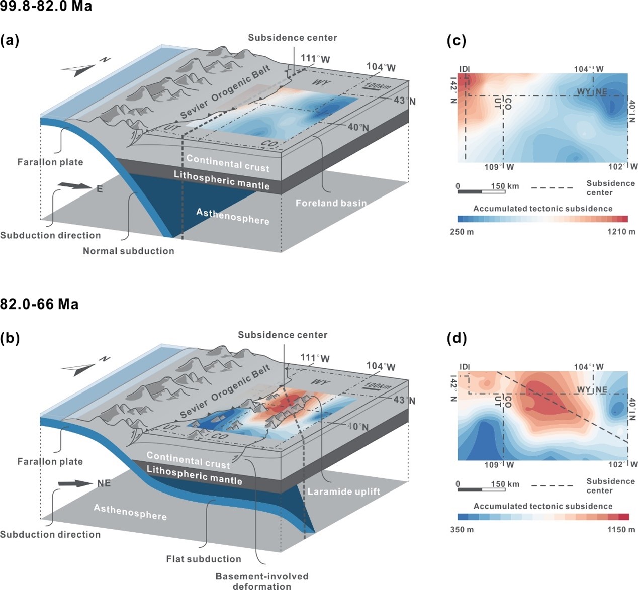 白垩纪北美西部内陆盆地因其丰富的露头数据、地下生物地层数据和岩石地层数据,成为研究盆地形成机制的理想区域。研究表明,盆地内构造沉降驱动因素主要包含Sevier造山运动、Laramide造山运动以及与Farallon板块俯冲相关的深部地幔活动引起的长波长动力沉降。在Sevier-Laramide造山运动期间,构造变形不仅决定了西部内陆盆地的几何形态,其产生的可容纳空间还通过与沉积物供给和海平面快速升降之间的不平衡调节共同控制了盆地内的沉积结构,产生了一系列向东快速生长推进的碎屑楔。另外,同期Farallon板块在俯冲方向和角度上的变化导致了动力沉降在整个区域的迁移,使得高速率的长波长动力沉降最初出现在盆地西部,随后随着俯冲板块的不断移动逐渐向东迁移。