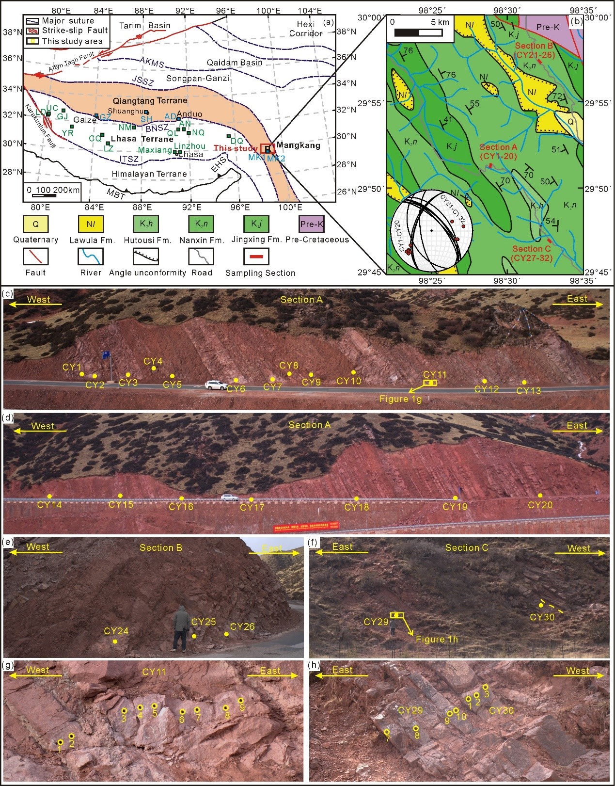 图1 (a)青藏高原及邻区构造简图;(b)芒康地区采样位置示意图;(c-h)采样地层剖面野外照片
