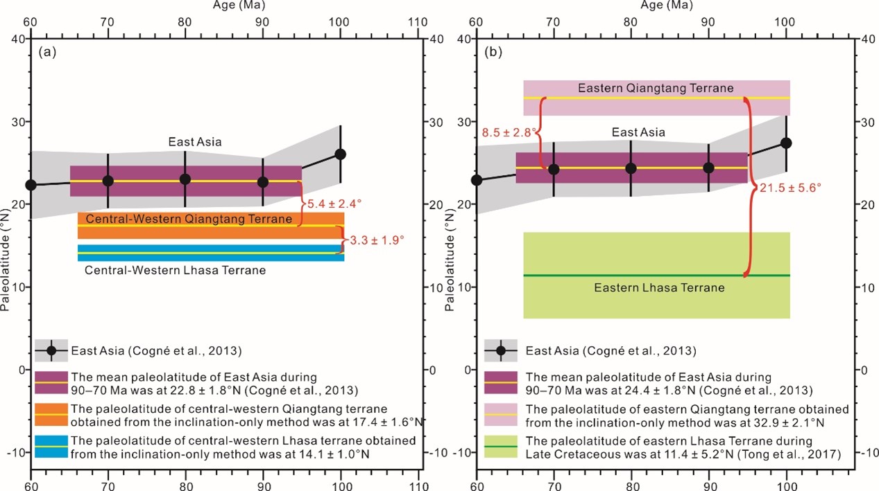 2.古地磁结果显示羌塘地块东部在晚白垩世后相对于亚洲大陆发生了940 ± 310 km的南向运动(图2);
