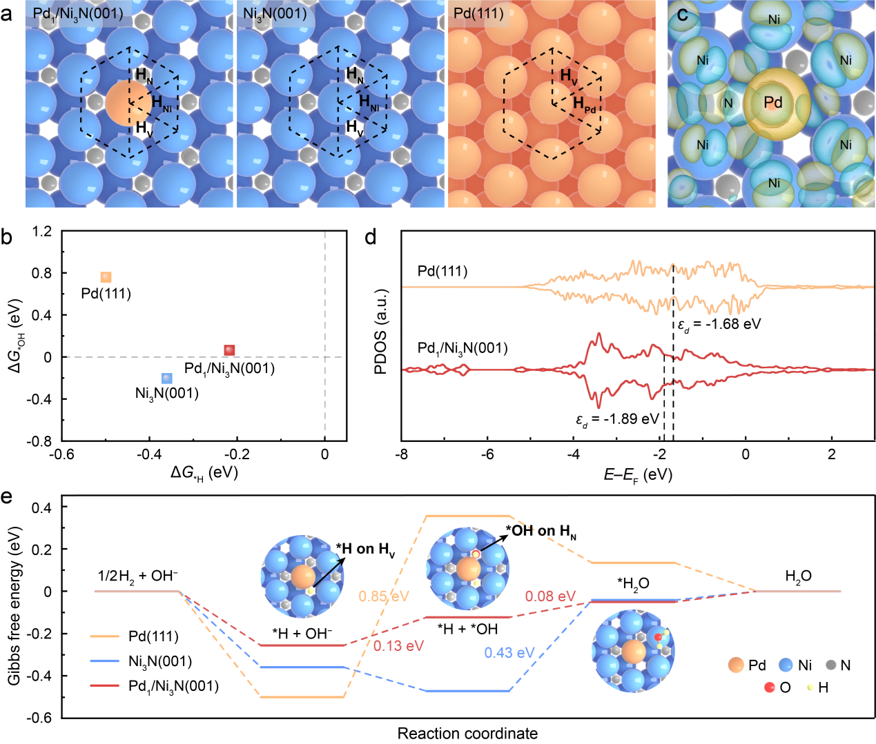 1. 通过理论计算和实验分析,发现引入Pd单原子形成的独特Pd1Ni2-Hv和Pd1Ni2-HN三重空位可以协同优化*H和*OH吸附能,从而加速HOR。