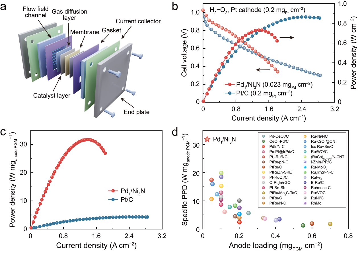 2. Pd1/Ni3N催化剂实现了优异的本征活性,抗氧化和抗CO毒化性能。在50 mV过电势下,Pd1/Ni3N的质量活性达到7.54 A mgPd-1。使用Pd1/Ni3N作为阳极的AEMFC在阳极贵金属用量仅为0.023 mgPd cm-2时实现了31.7 W mgPd-1的功率密度。