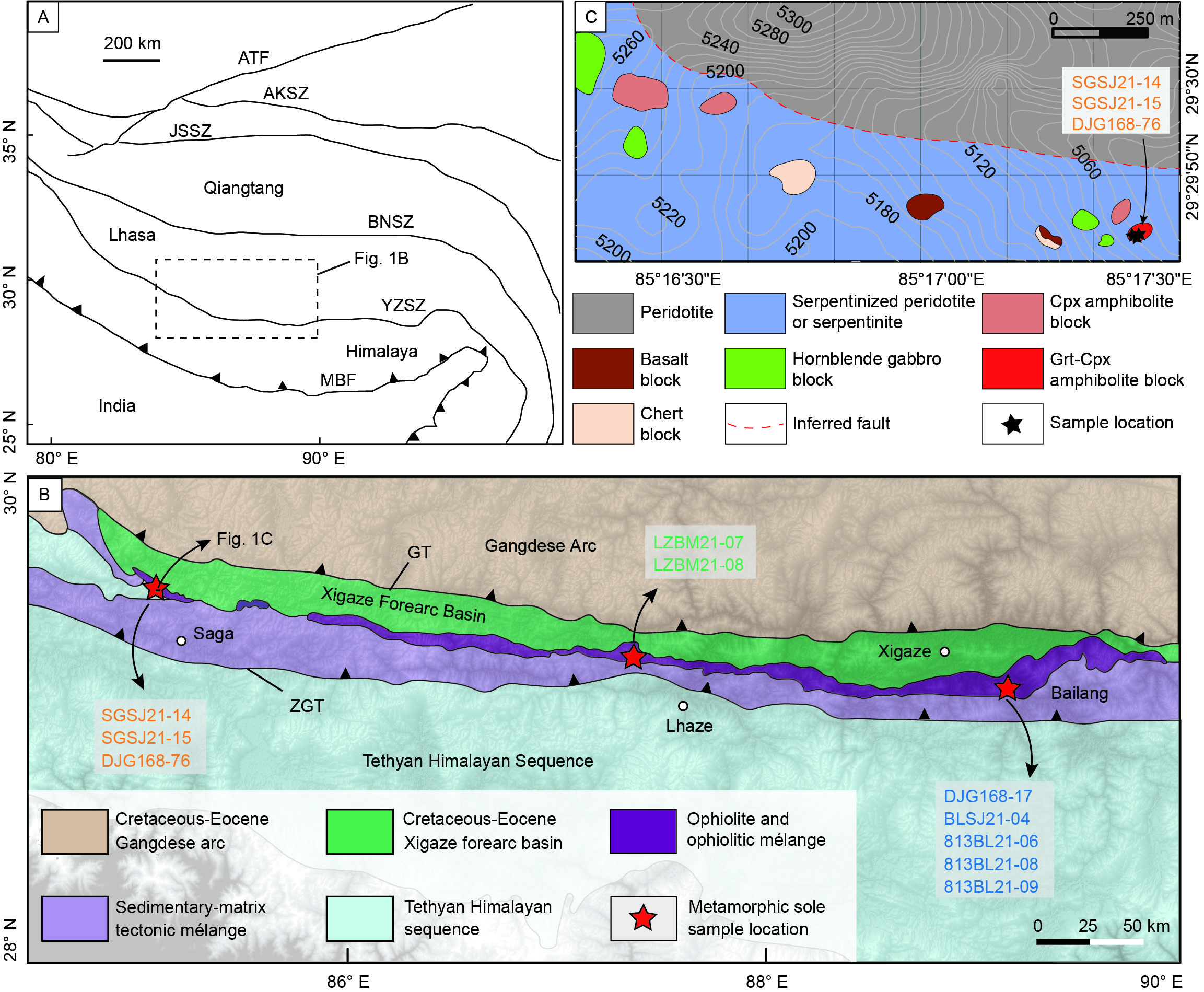 针对上述问题,中国地质大学(北京)地球科学与资源学院的沈洁博士生(已毕业)在戴紧根教授的指导下,联合张亮亮副研究员及杨凯博士生(已毕业),以西藏雅鲁藏布缝合带中–西段的白朗、拉孜和萨嘎蛇绿混杂岩为重点研究区,开展了系统的野外调查与室内分析。研究团队对混杂岩中的石榴角闪岩、浅色角闪岩等变质底板样品(图1),进行了岩石学、全岩地球化学、锆石–磷灰石–榍石U–Pb定年与微量元素分析,并结合已有年代学数据,系统重建了新特提斯洋东段的俯冲起始过程,取得以下主要认识: