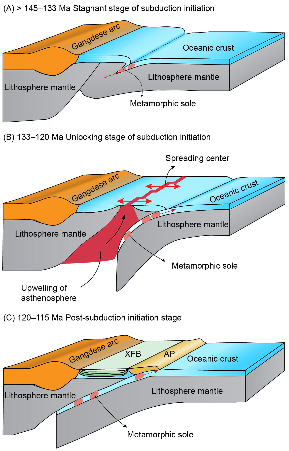 图3.雅鲁藏布缝合带中段新特提斯洋俯冲起始过程示意图,展示了从缓慢的俯冲停滞阶段(A, >145–133 Ma),到快速的俯冲解锁阶段(B, 133–120 Ma),再到后俯冲起始阶段(C, 120–115 Ma)的演化过程。XFB,日喀则弧前盆地;AP,增生楔。