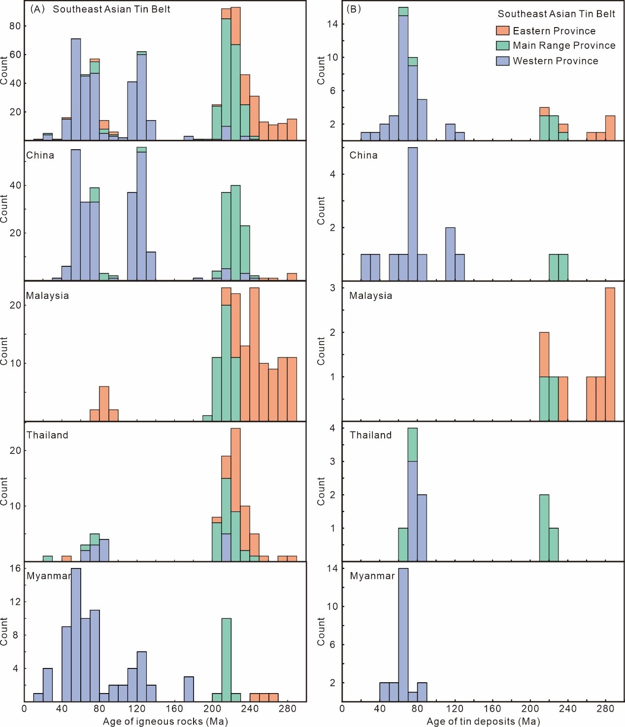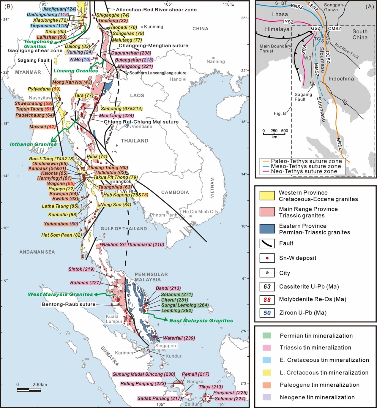 锡是全球战略性关键矿产。东南亚锡成矿带是世界最重要的锡产区之一,其成矿作用与特提斯构造演化密切相关。然而,该成矿带中锡花岗岩的时空演化规律及多期锡成矿机制仍未得到系统厘清。