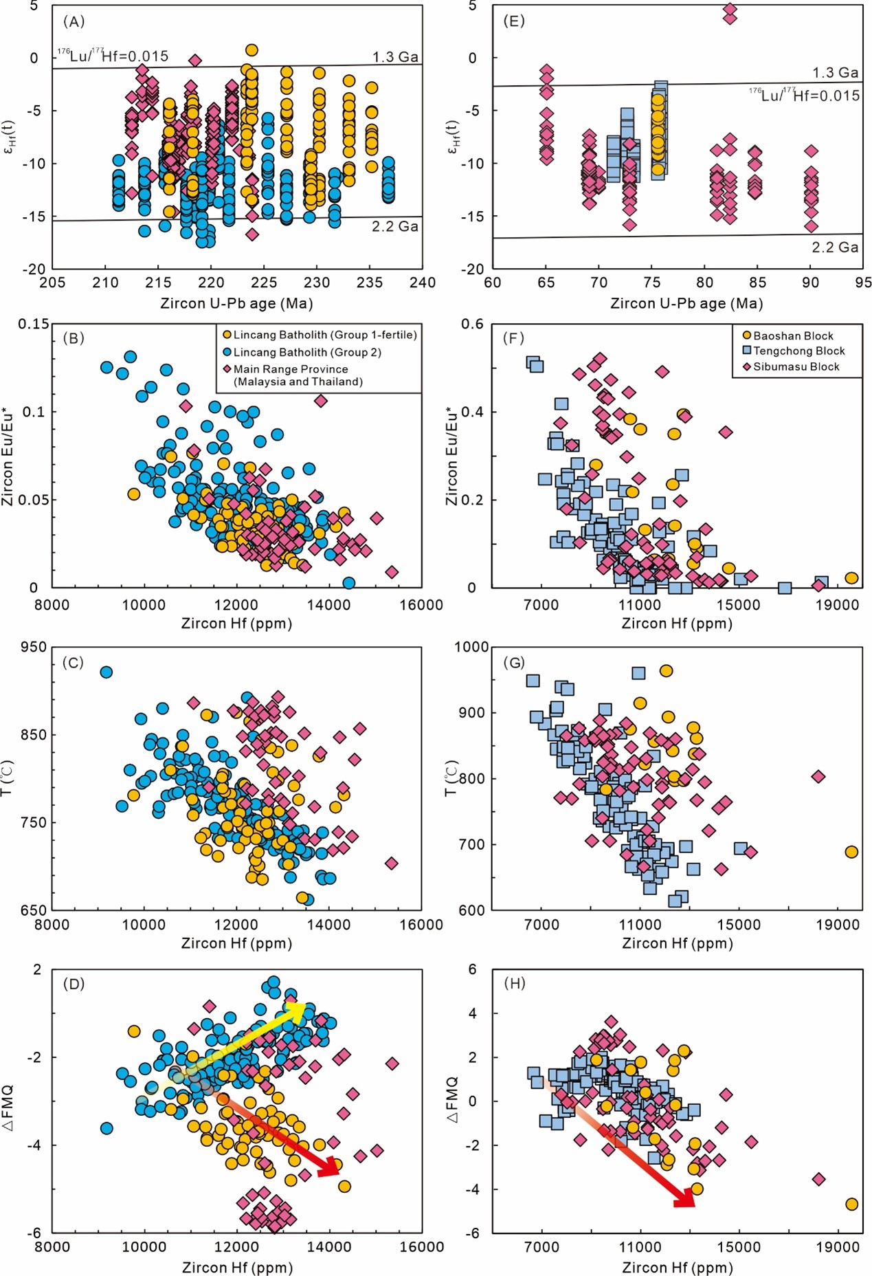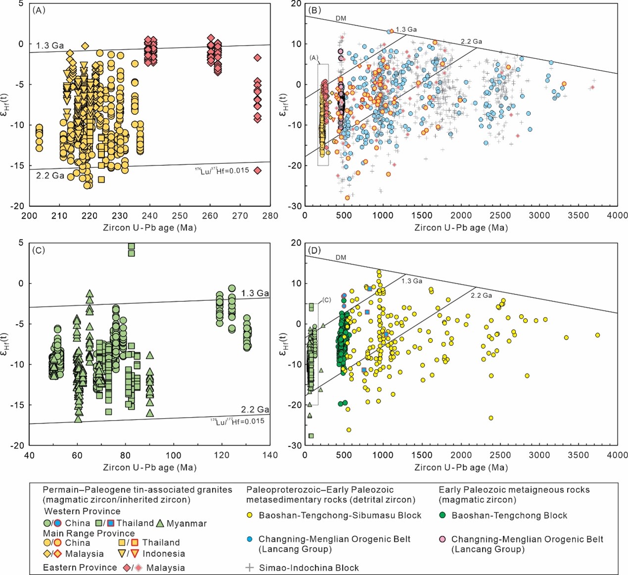 针对上述科学问题,中国地质大学(北京)“岩浆-热液演化与金属成矿”群体孙祥教授、邓军教授等合作,综合新的与已发表的锡石和锆石U–Pb定年、锆石微量元素与Hf同位素,以及全岩地球化学数据,系统重建了滇西-东南亚锡成矿带的时空演化格局,并揭示了多期锡成矿的控制机制。主要进展如下: