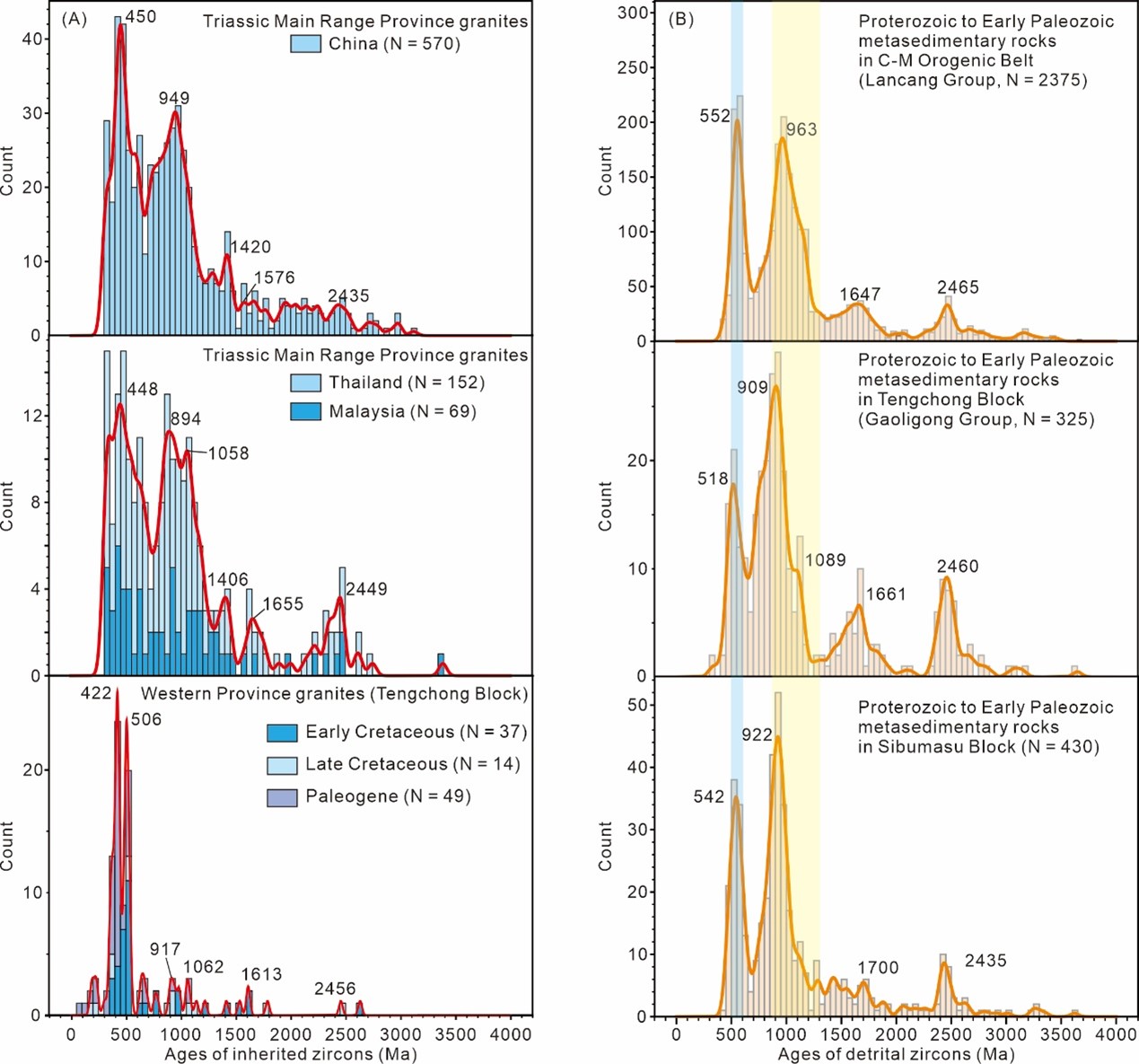 2、揭示多期锡花岗岩是基底变沉积岩周期性熔融产物。通过锡花岗岩的锆石Hf同位素(图3),以及花岗岩中继承锆石与变质基底的碎屑锆石年龄特征研究(图4),提出滇西-东南亚多期锡花岗岩是元古代-早古生代变沉积基底在特提斯演化过程中反复发生熔融的产物。这些基底虽未显著富集Sn,但富含B等挥发分,为锡花岗岩的多期形成提供了关键物质来源。