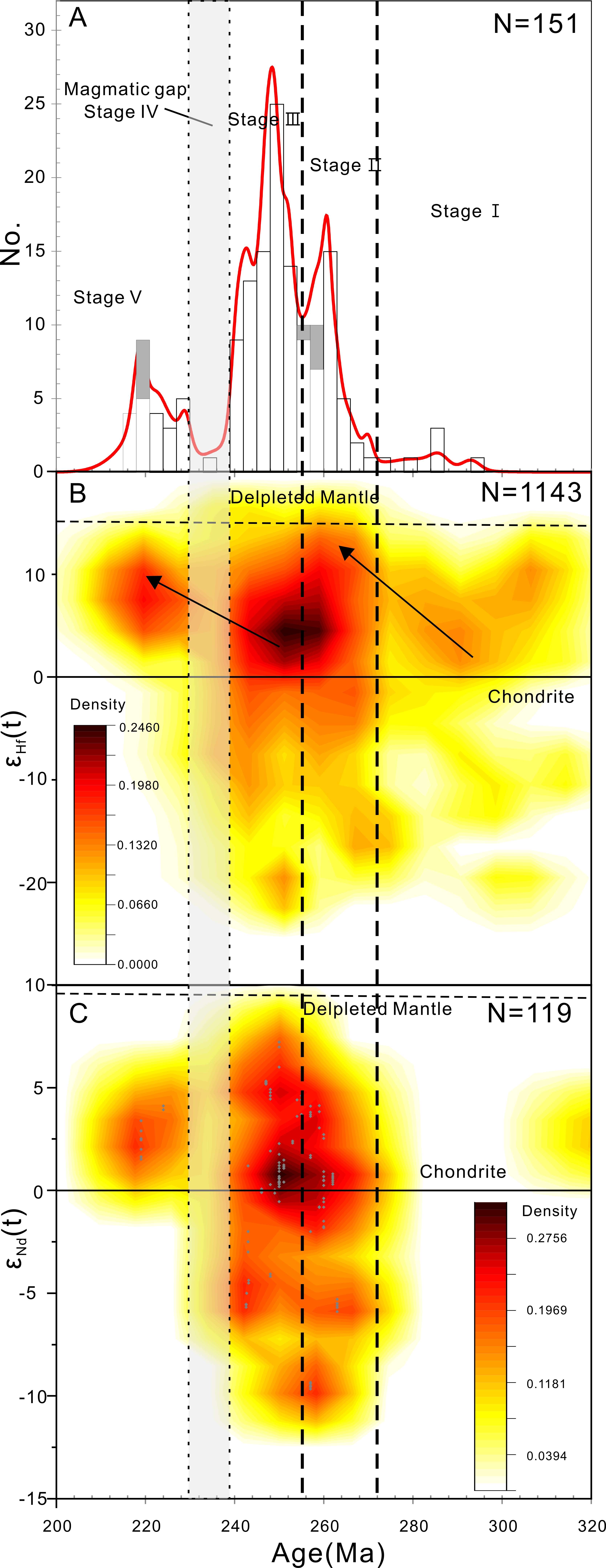(1)第一期为晚二叠世双峰式岩浆活动,包括中基性火山岩(258-259 Ma)与长英质火山岩(256-258 Ma)。中基性火山岩具有高的 MgO 含量(4.00-8.46 wt.%)和 Mg# 值(51-64),亏损的 Sr-Nd-Hf 同位素组成(ISr=0.704597-0.706031,εNd(t)=3.0-3.8,εHf(t)=7.5-11.0)等地球化学特征,表明其属于赞岐岩(sanukite),可能起源于受俯冲流体影响的交代亏损地幔楔的部分熔融(熔融程度 1%-10%)。同期长英质火山岩则表现出较高的 ISr 值(0.705210-0.716821)、负 εNd (t) 值(-0.87 至 - 0.82)及较低的 εHf (t) 值(3.45-10.75),指示其形成于下地壳的部分熔融。