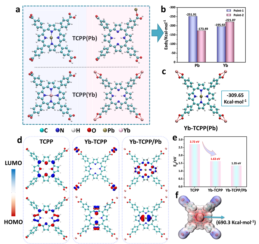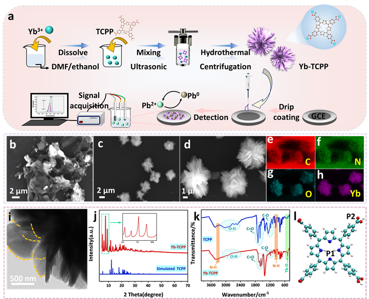 针对上述问题,我校水资源与环境学院博士生刘泽宇在薛强副教授的指导下,摒弃了以往繁琐的多种材料复合修饰电极的方法,通过简单的水热合成工艺将稀土元素镱(Yb)引入TCPP结构中制备出具有优越性能的簇状结构,并采用一步滴涂方法改性碳电极。同时,系统分析了改性电极的理化性质、深入探究了提高Pb(II)检测效率的传感机理。取得的创新性发现如下: