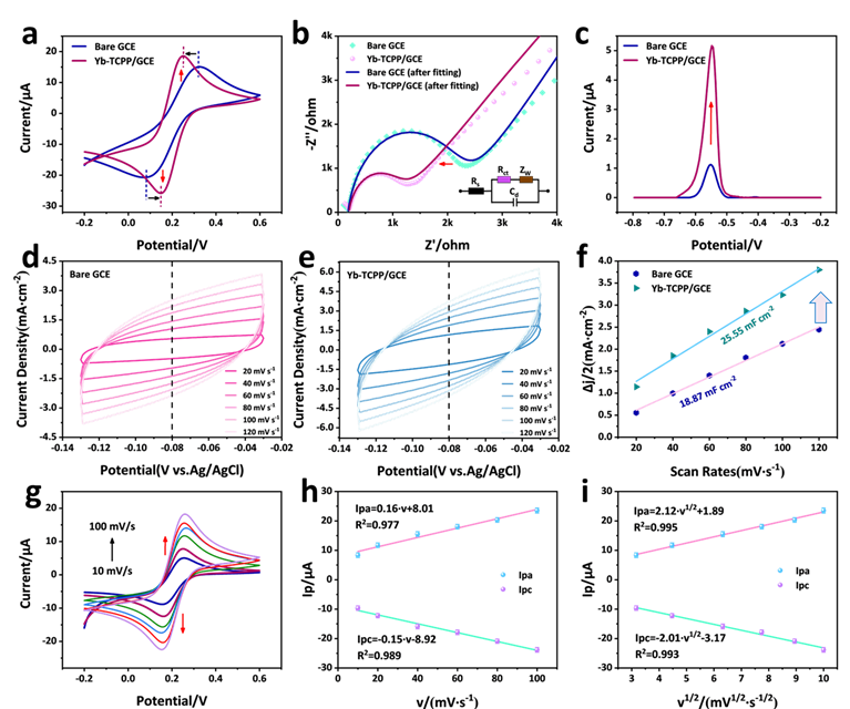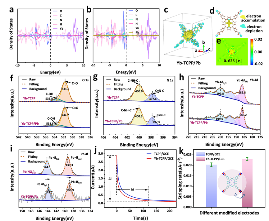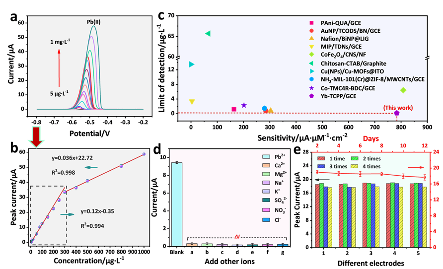 本研究在操作简单的基础上建立了一种双功能策略:稀土元素镱的掺杂优化了电子传递,同时保留了结构中目标物质识别位点。从多个角度揭示了改性材料对水环境中Pb(II)高效传感检测的机理。这为实现简单高效的电极构建和实际场景中Pb(II)的灵敏检测提供了理论支持。