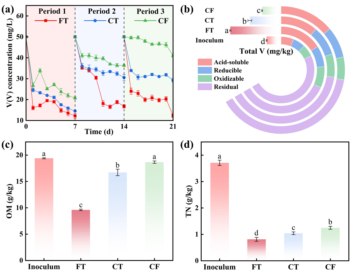 钒(V)作为一种重要的过渡金属元素,具有独特的化学性质,在钢铁生产、化学化工和工业催化中得到广泛应用。采矿、冶炼和化石燃料开采等人为活动显著增加了钒向土壤和地下水的迁移,加剧含水层污染。V(V) 作为毒性最大、迁移性最高的价态,对细胞产生氧化型损伤,难以自动修复。将 V(V) 还原成毒性较小且不易溶解的 V(IV) 是钒生物地球化学和解毒的重要过程。然而,目前微生物还原 V(V) 的研究均在恒温条件下进行,温度波动条件下微生物还原 V(V) 的性能和微生物代谢机制,尚不明晰。全球约有23%的地区会经历由季节变化或昼夜交替导致的周期性冻融循环现象。冻融循环作为重要的非生物胁迫因子,能显著改变微生物活性。冻融循环条件下微生物介导的地下水 V(V) 还原机制仍知之甚少。