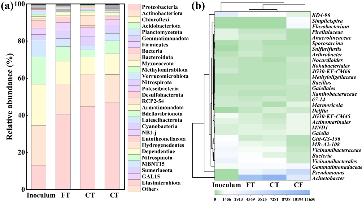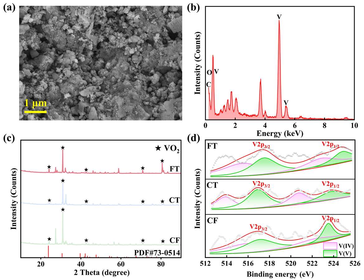 (1)冻融循环条件(FT:-4~4 ℃)与恒温条件(CT:4 ℃和CF:-4 ℃)微生物还原性能及光谱学表征:较恒温条件相比,冻融循环体系显著加速了微生物 V(V) 还原效率,增加钒的生物利用度,加速了对沉积物中有机质和总氮的利用(图1)。光谱学技术证明微生物将 V(V) 还原为 V(IV),以无定形的 VO2 形式存在(图2)。
