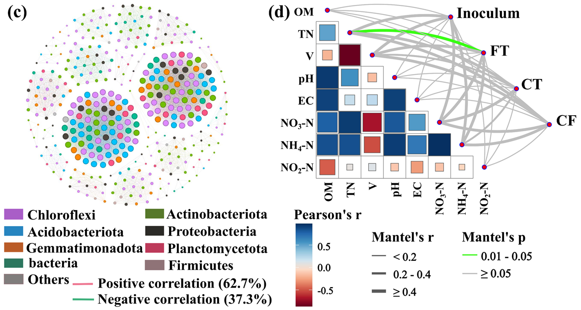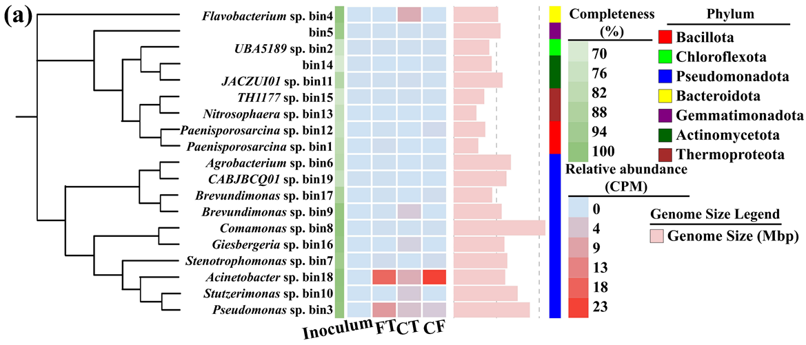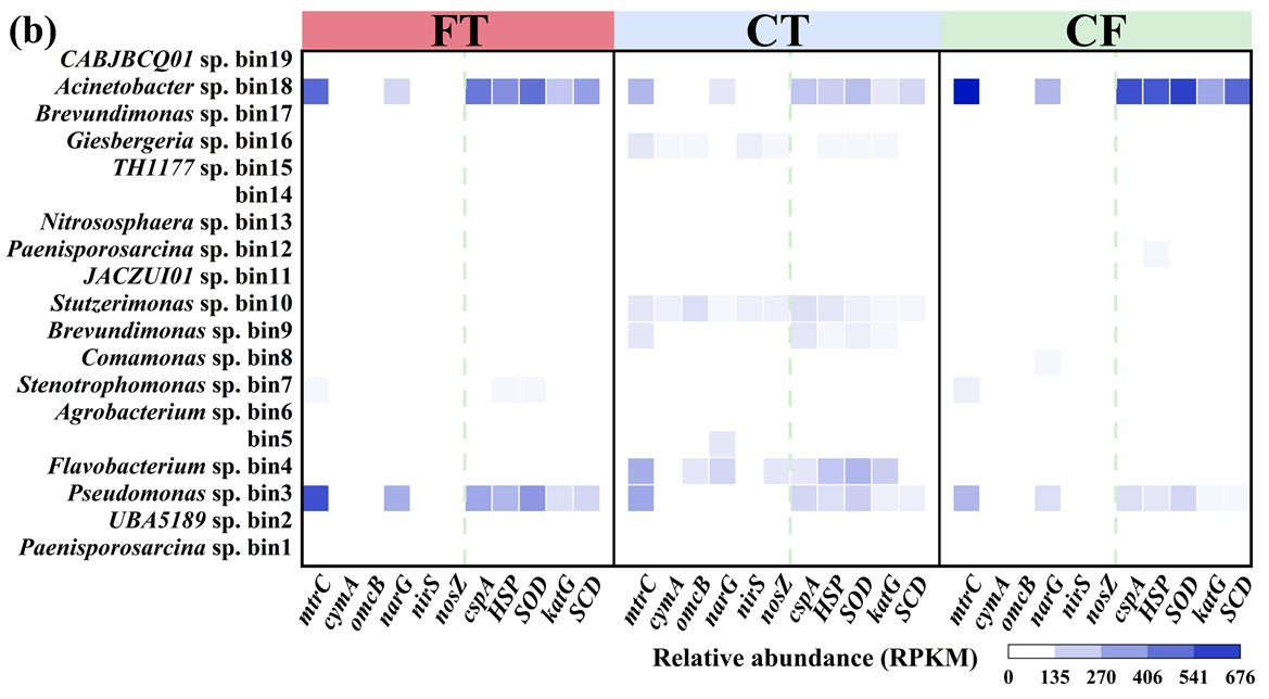 (2)沉积物中微生物群落在孵育过程中发生了显著的变化。冻融循环体系表现出更高的丰富度和多样性,总氮含量与微生物群落结构存在显著的正相关关系(图3)。Pseudomonas sp. bin3和Acinetobacter sp. bin18等五个MAGs中含有与胞外电子传递、反硝化及抗冻能力的基因,在高钒和低温胁迫下表现出不同的生存策略(图4)。