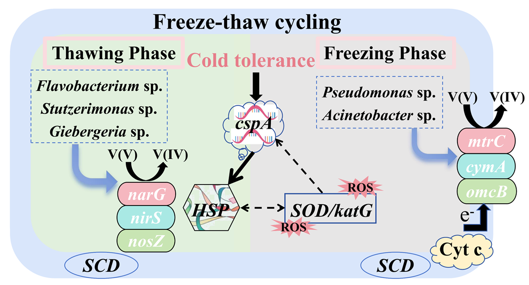 本文揭示了以往未报道的冻融循环下 V(V) 的生物地球化学还原,阐明微生物在高钒和温度波动条件下微生物代谢生存机制,提供了冻融循环条件下微生物 V(V) 还原的新见解,有助于制定针对性的修复策略。