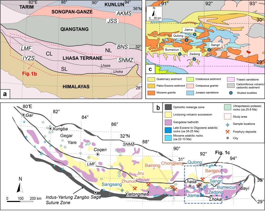 针对以上科学问题,我校科学研究院博士研究生周秋石在王瑞教授的指导下,与瑞典国家自然历史博物馆Heejin Jeon开展合作,对青藏高原南部的驱龙和甲玛两个大型斑岩矿床,结合泽当县贫矿花岗质岩基、桑桑县深部地壳包体、桑日县辉长岩体样品,开展了系统的地球化学研究(图1),通过磷灰石原位S同位素,辅以磷灰石CL成像、探针分析,全岩数据等手段,取得以下创新认识: