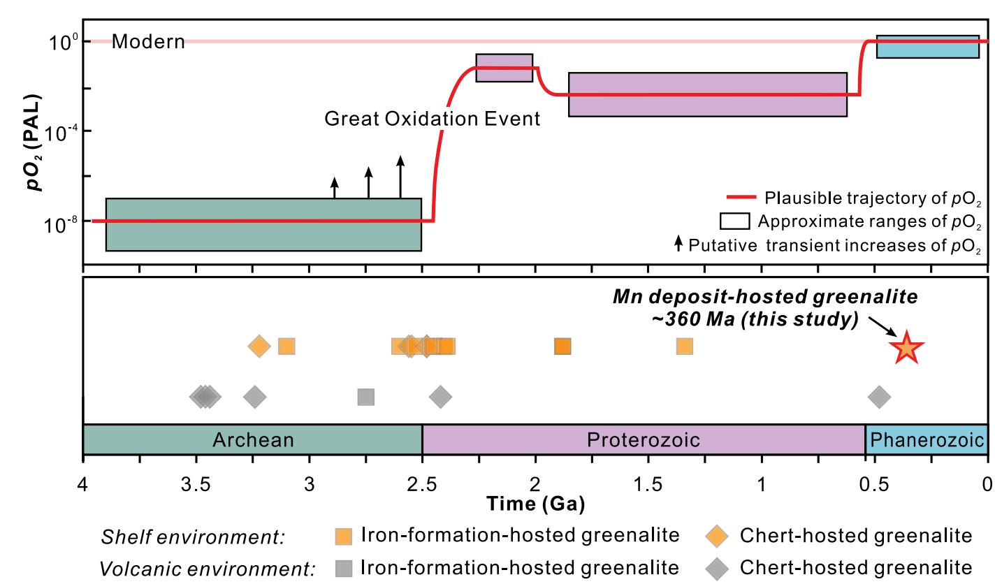 图1 太古宙至显生宙原生铁蛇纹石的地质记录与大气氧含量变化关系