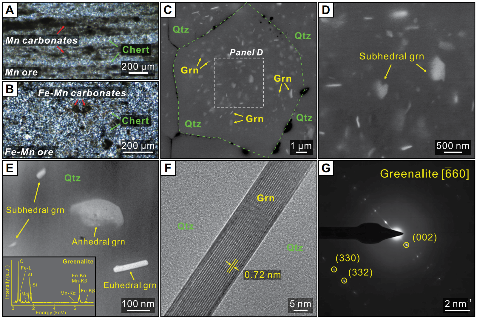 图2 A-B富硅锰矿石显微照片;C-D石英颗粒包裹铁蛇纹石(Grn)的扫描电镜图像;E自形-它形铁蛇纹石透射电镜图像及EDS能谱;F铁蛇纹石高分辨透射电镜图像;G铁蛇纹石纳米电子衍射图