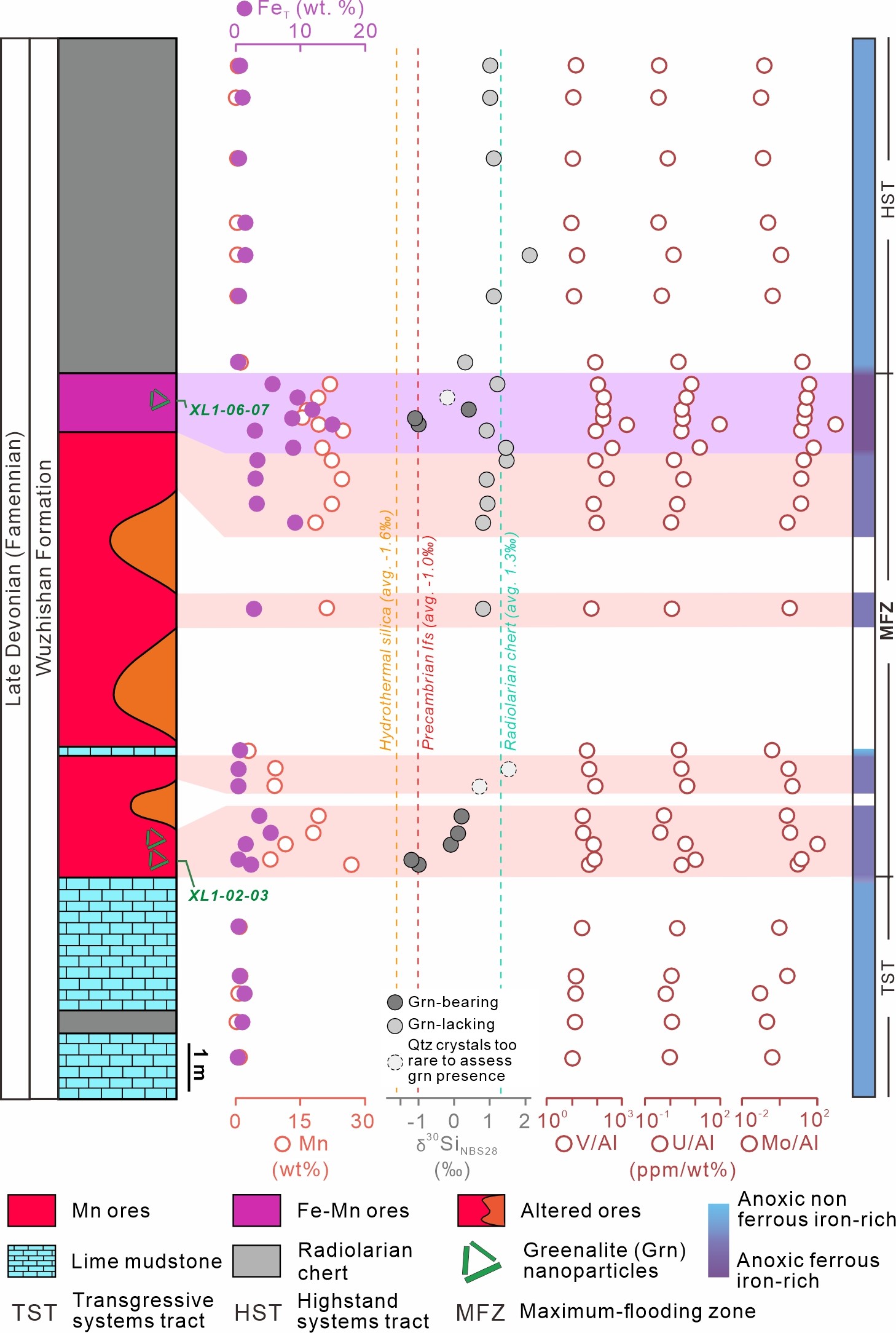 针对这一科学问题,中国地质大学(北京)陈方戈副教授、王庆飞教授、邱昆峰教授和邓军教授等团队成员,联合加拿大女王大学Peir K. Pufahl教授、卡普顿大学Edward J. Matheson副教授、中国科学院广州地球化学研究所鲜海洋研究员、席佳鑫博士后、中国科学院南京地质古生物研究所南景博副研究员和广西第四地质队阮荻高工,对华南板块西南缘上泥盆统下雷锰矿开展了层序地层学、矿物学、扫描电镜、透射电镜、全岩元素和碳-硅同位素地球化学等综合研究,取得如下新认识: