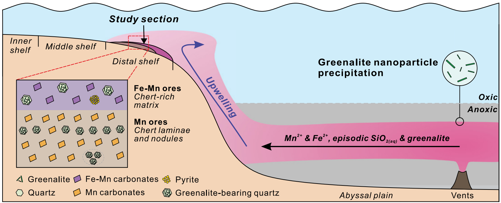 (3)铁蛇纹石从热液喷口沉淀并搬运至陆棚的过程,反映了区域尺度底层海水的缺氧事件(图4),可作为识别显生宙大洋缺氧事件的新指标。
