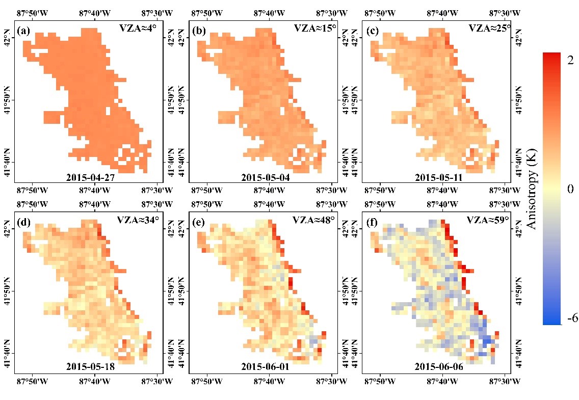 研究将城市热各向异性几何模型(GUTA-T)与增强型年温度循环模型(ATCE)相结合,对传感器垂直观测方向LST进行动态参数化,突破了传统方法中垂直观测LST难以确定、依赖同步多角度观测的限制,实现了对非同步多角度MODIS LST的物理约束校正。