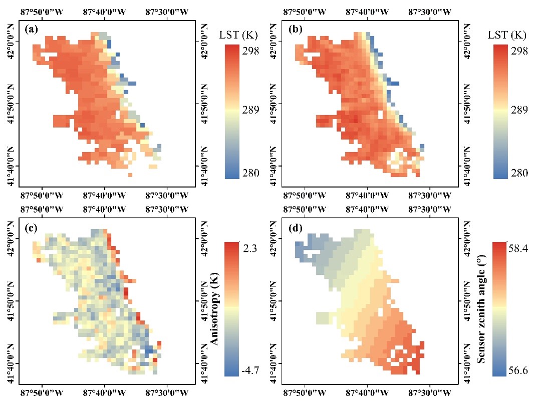 图4 芝加哥地区角度效应校正前后MODIS地表温度的对比;(a)原始MODIS LST。(b)角度效应校正后的MODIS LST。(c)模拟热各向异性。(d)观测天顶角