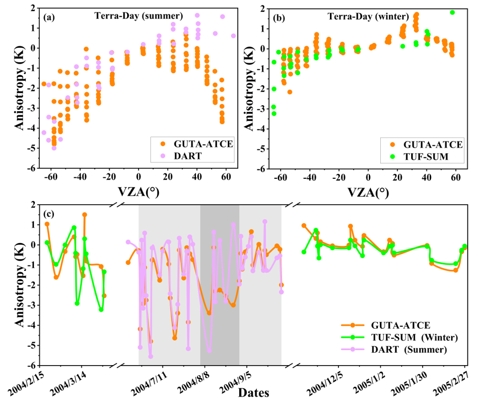研究表明,城市热各向异性在季节尺度、观测角度及不同建筑密度和高宽比条件下均表现出显著差异。GUTA-ATCE能够准确再现这些变化特征,其模拟结果与基于地面实测数据的DART和TUF-SUM模型模拟结果保持高度一致。