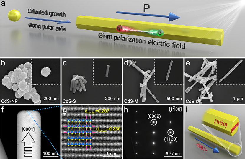 图1. 晶体定向极化促进体相电荷分离示意图;CdS纳米颗粒与纳米棒的形貌和结构表征