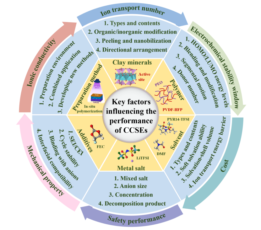 图1.黏土复合固态电解质中关键性能的影响因素