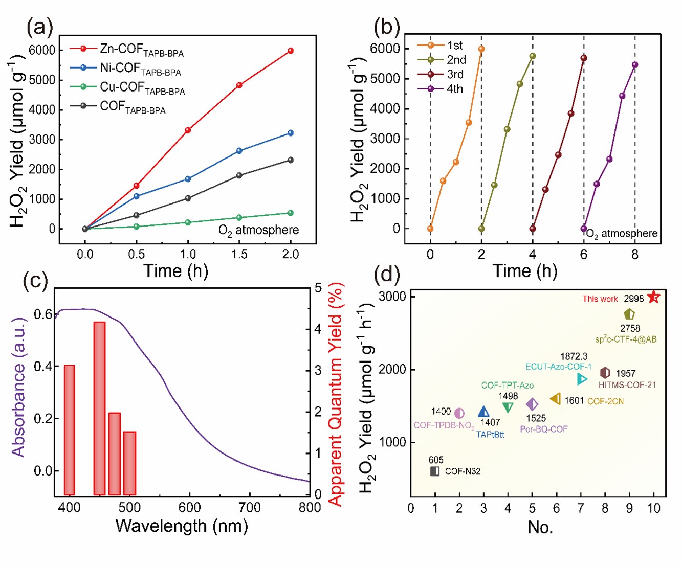 2. 模拟太阳光下,Zn-COFTAPB-BPA在纯水中实现了2998 μmol g-1 h-1的H2O2产率,并在450 nm波长处达到4.17%的表观量子产率。