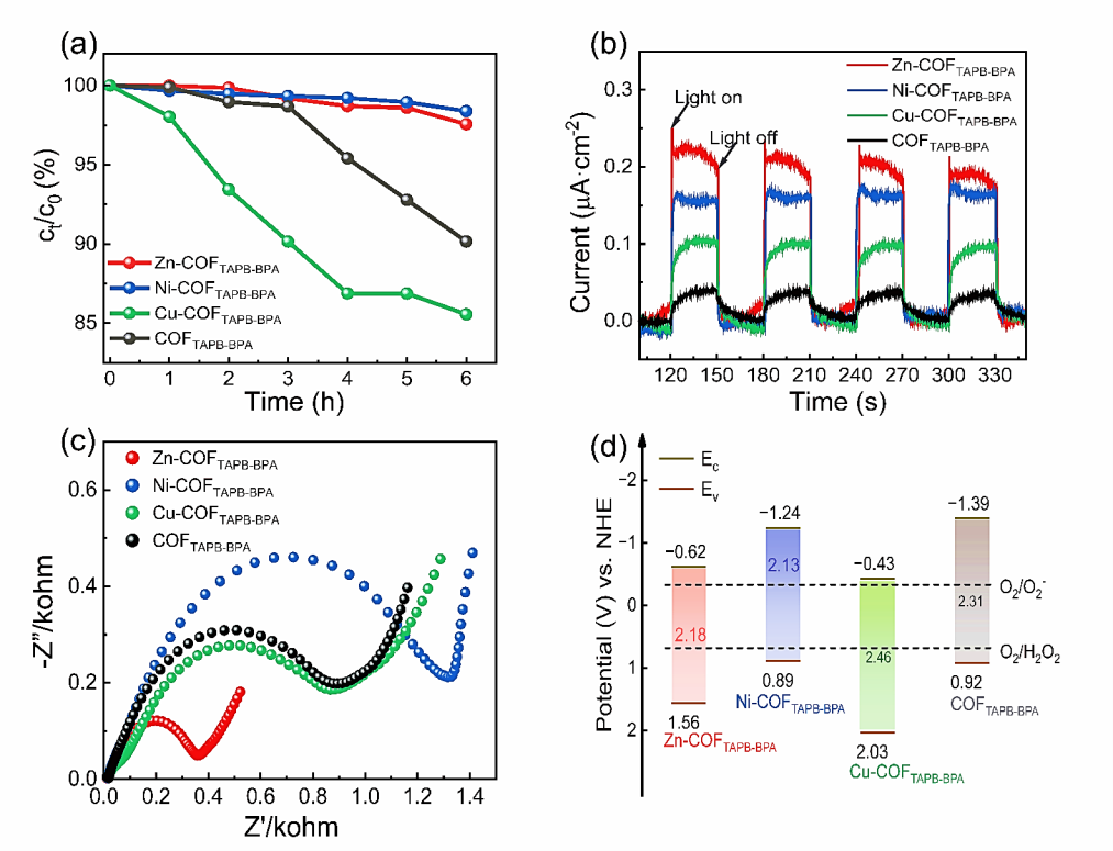 针对上述问题,我校数理学院刘煊赫教授、孙兵副教授利用配位自组装策略,设计制备了一系列锚定于吡啶基亚胺类共价有机框架的金属单原子催化剂(M-COFTAPB-BPA, M = Zn, Ni, Cu)。其中,Zn-COFTAPB-BPA在纯水中的光催化制H2O2产率达到2998 μmol·g-1·h-1,表观量子产率为4.17% (λ = 450 nm)。本研究为通过精确的单原子工程设计开发高性能COFs光催化剂提供了合理的设计策略。