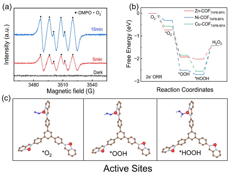 图4. 不同条件下Zn-COFTAPB-BPA的EPR信号(DMPO为捕集剂)和DFT计算分析