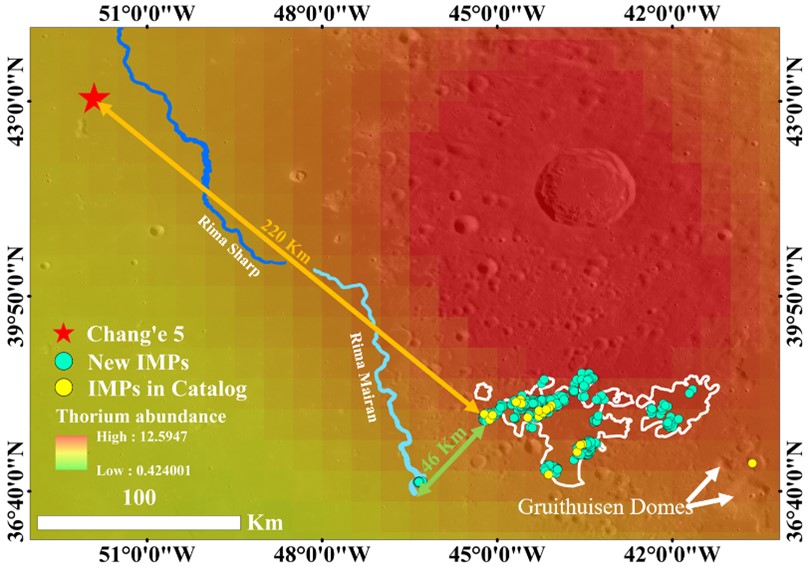 图1.研究区IMPs分布(底图为LROC WAC以及钍丰度数据)