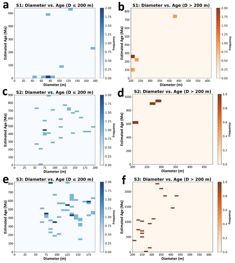 图4. 通过撞击坑地形扩散模型估算的年龄范围。(a)和(b) S1 区域IMPs相关撞击坑直径与退化年龄散点图;(c)和(d) S2 区域撞击坑直径与退化年龄散点图;(e)和(f) S3 区域撞击坑直径与退化年龄散点图