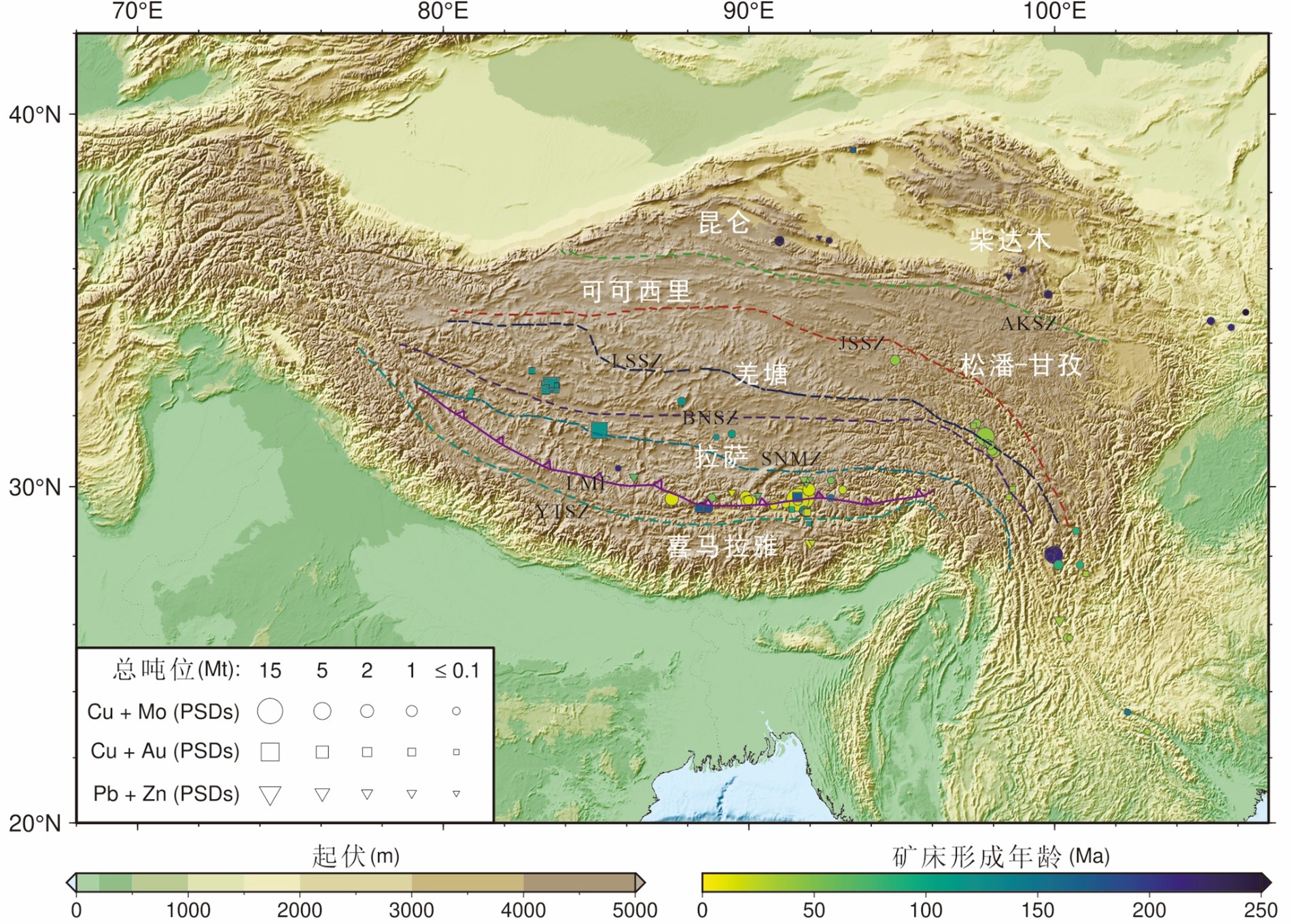 青藏高原是斑岩系统矿床最重要的产区之一(图1),其具备长期、强烈且多阶段的构造变形与岩浆活动历史,因此是研究“成矿-隆升-剥露-保存”耦合过程的理想区域。不同地体在隆升时序、幅度与剥露强度上存在显著差异,导致深部矿床的暴露与保存潜力呈现空间非均一性。然而,尽管过去二十余年围绕高原隆升的时间、持续期与速率提出了大量约束(同位素、化石组合、岩浆岩地球化学等),不同指标之间仍存在较大不一致;更重要的是,相关研究多聚焦古海拔重建或者剥露速率本身,对其与斑岩系统矿床矿化-保存过程的系统耦合讨论仍相对不足。