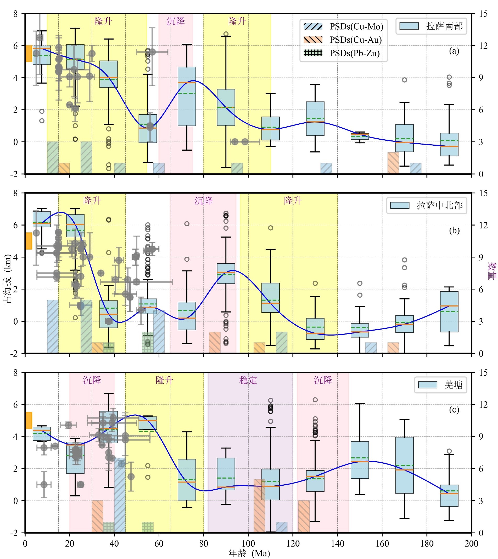针对上述问题,中国地质大学(北京)地球科学与资源学院博士生张鹏,在其导师成秋明院士和张振杰副教授的指导下,受国家留学基金委(CSC)的资助赴澳大利亚国立大学与Mark Hoggard研究员展开合作,以收集汇编的青藏高原全岩地球化学、锆石地质年代学和低温热年代学数据集为基础,应用机器学习模型、时间序列分析、空间分析等方法,重建了高原侏罗纪以来不同地体的构造和岩浆演化(图2)、古海拔变化(图3)及时空剥露格局(图4),并进一步探讨了上述过程对斑岩矿床成矿与保存之间的联系。取得的创新认识如下: