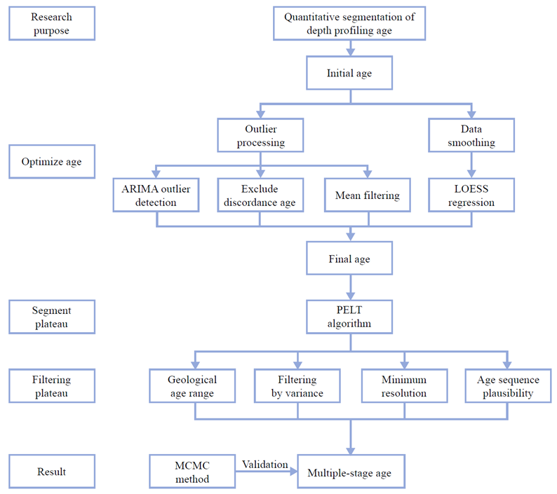 图1 深度剖面年龄的定量划分流程。缩略语:ARIMA,自回归积分滑动平均模型;LOESS,局部加权回归;PELT,修剪精确线性时间算法;MCMC,马尔可夫链蒙特卡洛方法