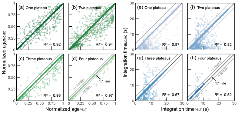 图2 PELT算法识别的归一化年龄和积分时间与MCMC方法后验结果的比较。缩略语:RMSE,均方根误差